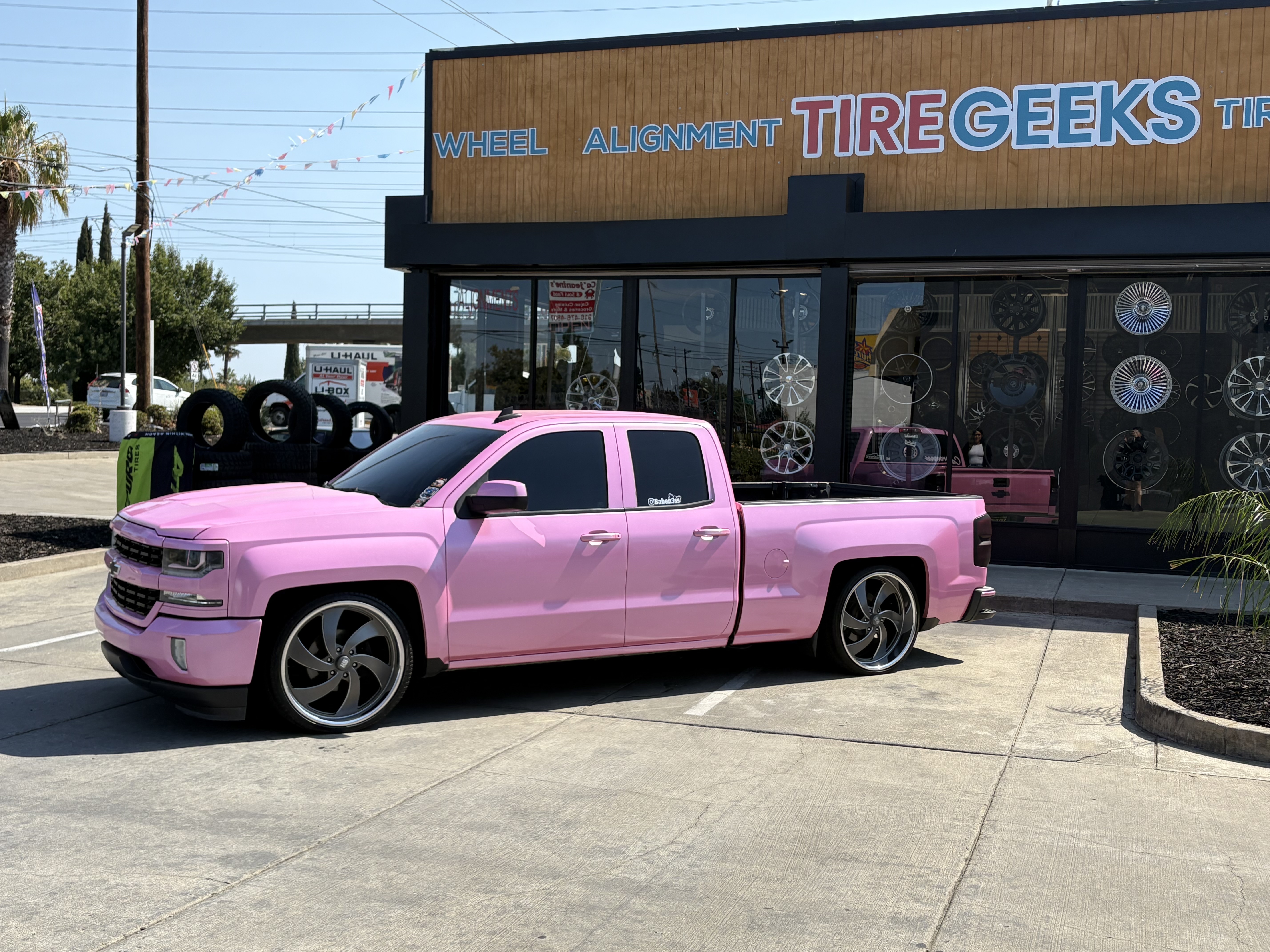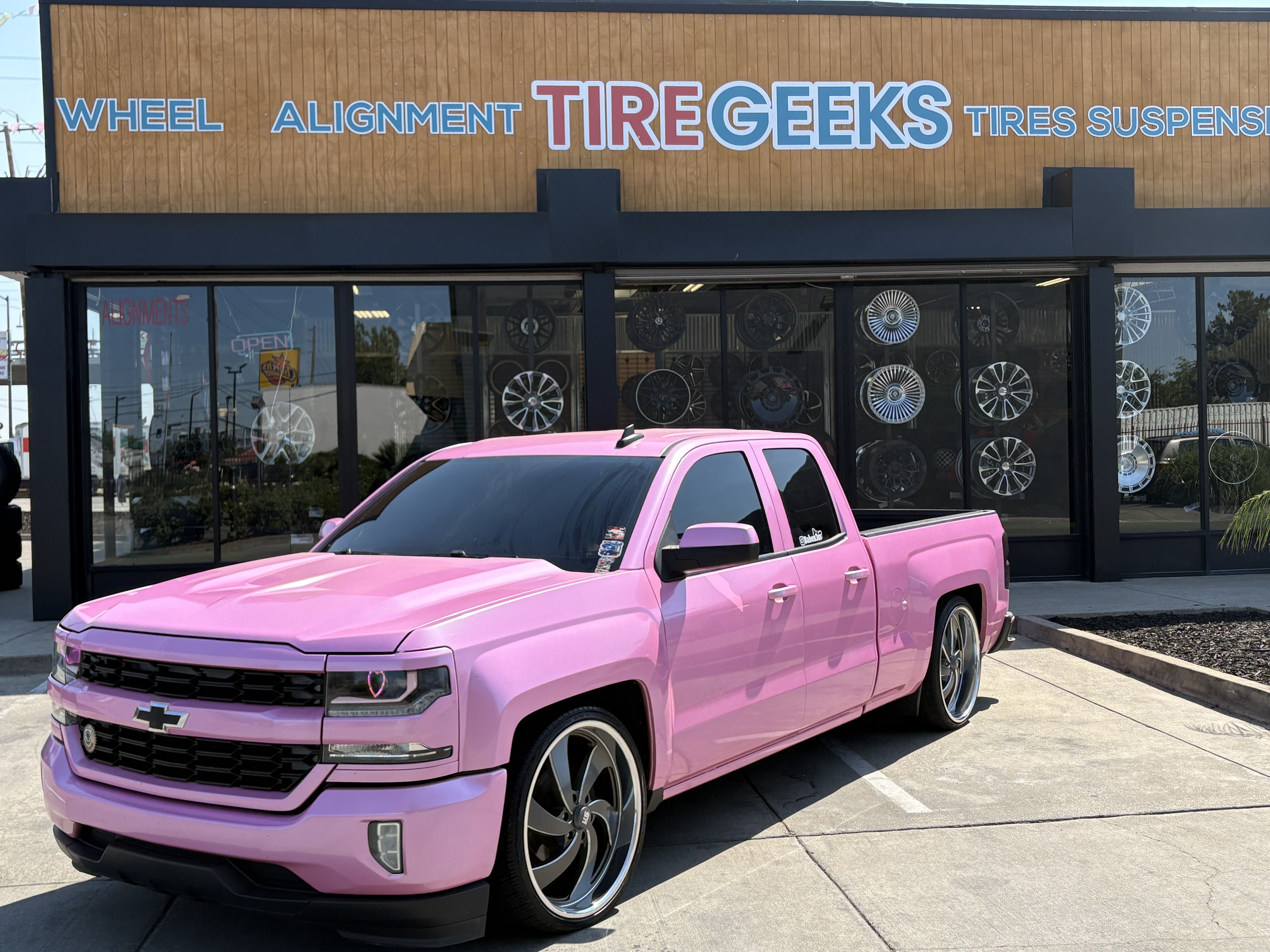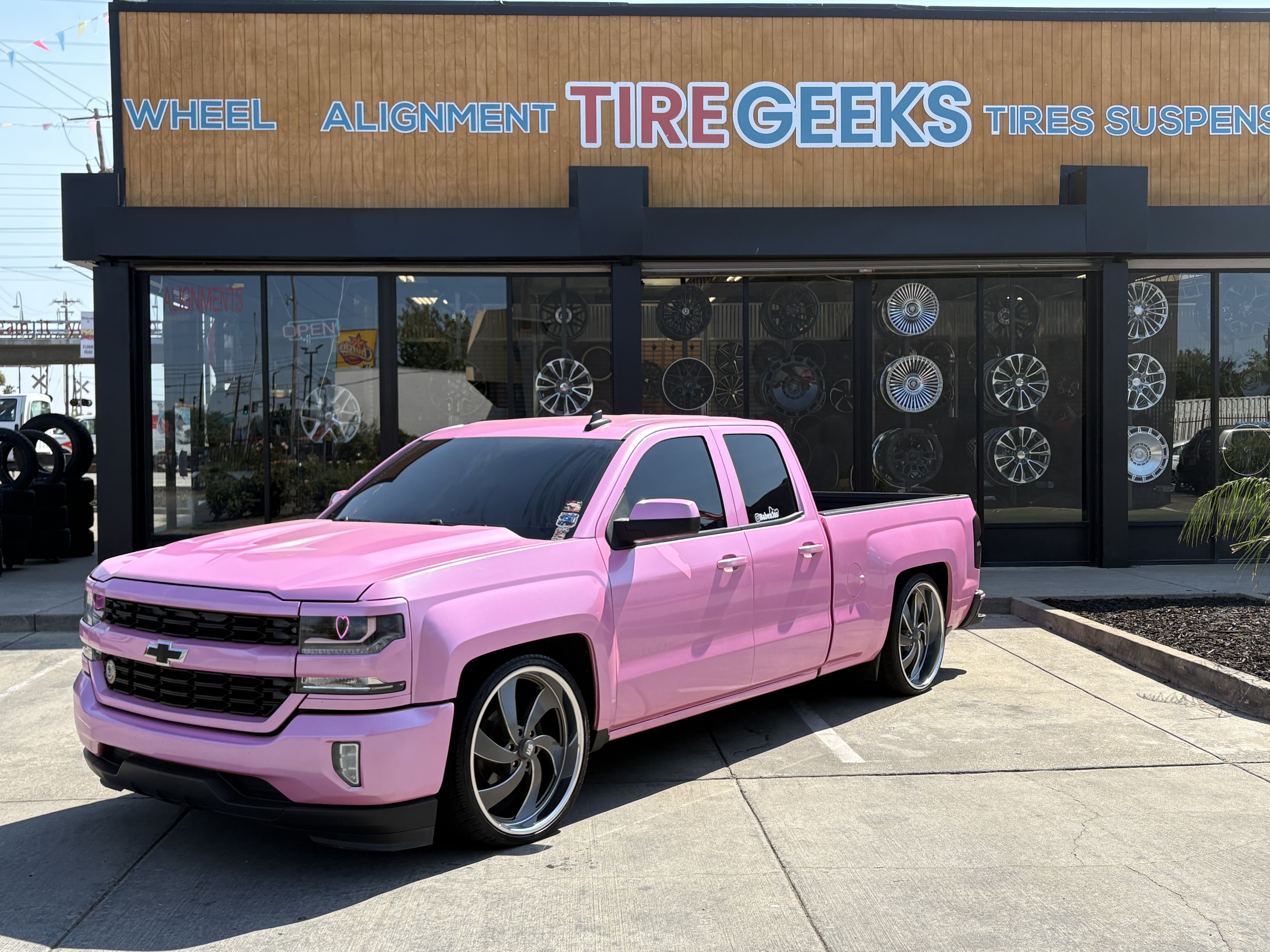 Custom pink Chevy Silverado slammed on chrome blade wheels. One of the most unique builds to come through our shop — a head-turner everywhere it goes.